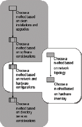 To choose the best automated installation method for your situation, you need to systematically evaluate a variety of different aspects of your installation circumstances. These aspects include the logistics of the actual installation, the hardware and software involved in the installation, and the network and IT infrastructure of your organization. Use the hardware and software inventory and deployment plans of your organization as the source for this information. For more information about inventories, see "Planning for Deployment" in Planning, Testing, and Piloting Deployment Projects of this kit.