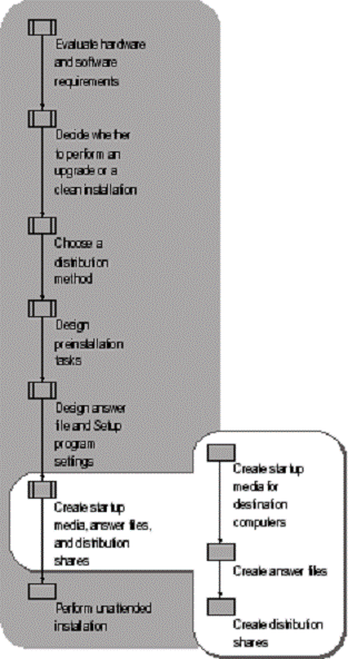 Figure 2. shows the steps you must follow to create startup media, answer files, and distribution shares for an unattended installation.