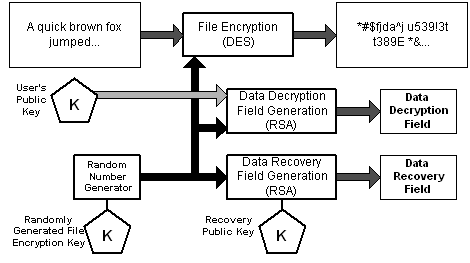 The user's plaintext file is encrypted using a randomly generated FEK. This file encryption key is stored along with the file, encrypted under a user's public key in the DDF and encrypted under the recovery agent's public key in the DRF.