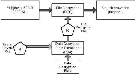 A user's private key is used to decrypt the FEK using the corresponding encrypted FEK item in the DDF. The FEK is used to decrypt file data reads on a block by block basis. Random access to a large file will decrypt only the specific blocks read from disk for that file. The entire file does not have to be decrypted.