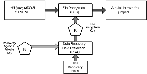The process is similar to decryption except that it uses the recovery agent's private key to decrypt the FEK in the DRF. This simple scheme provides a strong encryption technology and the ability to let multiple users share an encrypted file, as well as allowing multiple recovery agents the ability to recover the file if so required. The scheme is fully algorithm agile and any cryptography algorithms can be used for various encryption phases. This will be very important as new and better algorithms are invented.
