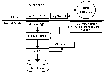 EFS service. The EFS service is part of the security subsystem. It uses the existing LPC communication port between the Local Security Authority (LSA) and the kernel-mode security reference monitor to communicate with the EFS driver. In user mode it interfaces with CryptoAPI to provide file encryption keys and generate DDFs and DRFs. The EFS service also provides support for Win32 APIs, which are programming interfaces for encryption, decryption, recovery, backup and restore. These Win32 APIs support remote encryption, decryption, backup and restore operations