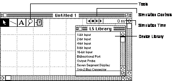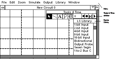 The selection arrow should be the active tool and cursor. It's the active tool because its icon is inverted in the tool bar. The 0 ns displayed with the simulation controls represents the current simulation time. It is zero because you have not told B Logic to start simulating the circuit yet. Just to get a hang of the interface, try moving the device library around by dragging its title bar. You can resize it by dragging the edges and corner. You can also move the Tools and Time window around, but it can't be resized. The circuit window itself can also be moved and resized.