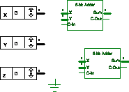 The component titled 8-bit Adder, which is used twice in the following circuit, is a User-Defined Circuit. The first part of this tutorial involves the design of the 8-bit Adder component. The second part will involve the design of the 3-way Adder shown in the following figure. If you don't want to spend the time on the first part of the tutorial, the result of the first part can be found in the file Adder2x8., and you can go on to Part II.