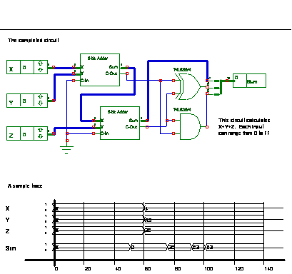 This tutorial will help you learn how to use buses (grouped wires), user-defined subcircuits, the trace window, and command files. The final circuit will be capable of calculating X+Y+Z, where X, Y, and Z can range from 0 to FF in hexadecimal (255 in decimal).
