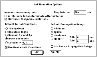 Choose Simulation Options from the Simulate Menu. This will bring up the following dialog box. Set the initial conditions to indeterminate (Weak Unknowns). Set the dynamic violation options at the top of the dialog box to notify the user of dynamic violations. Also, check Use Device Initial Conditions, which will allow you to override the unknown initial condition for specific device outputs later in this tutorial.