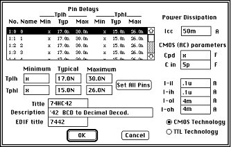 Change the title to 74HC42, and the EDIF title to LS42. Then set the rise times and fall times according to the values shown in the preceding figure. A value of X means unspecified. In general a device's propagation delay parameters, as well as parameters for power consumption, fan-in and fan-out restrictions can be found in data books published by chip suppliers. Check the CMOS technology button. When you're done, choose OK.