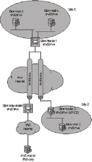 Tunnel across the IPv4 Internet by using a 6to4 router. A 6to4 host can communicate with a non-local 6to4 host by using a tunnel from a local 6to4 router across an IPv4 network (such as the Internet) to a 6to4 router at the destination site. The first 6to4 router encapsulates the packet in an IPv4 header; the receiving 6to4 router removes the IPv4 header and then forwards the IPv6 packet to the destination 6to4 host. During the first and last stages of the packet's transmission - from the sending 6to4 host to its 6to4 router, and from the recipient 6to4 router to the destination 6to4 host - the IPv6 routing infrastructure in place at each site is used. In Figure 1.16, 6to4 Host A (or 6to4 Host B) sends its packet to 6to4 Router 1, which tunnels it across the IPv4 Internet to 6to4 Router 2, which then forwards the packet to 6to4 Host C.