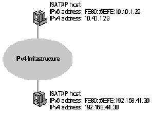 Figure 1.17 shows two IPv6/IPv4 hosts communicating over an IPv4 network by using each other's automatically configured link-local ISATAP address.