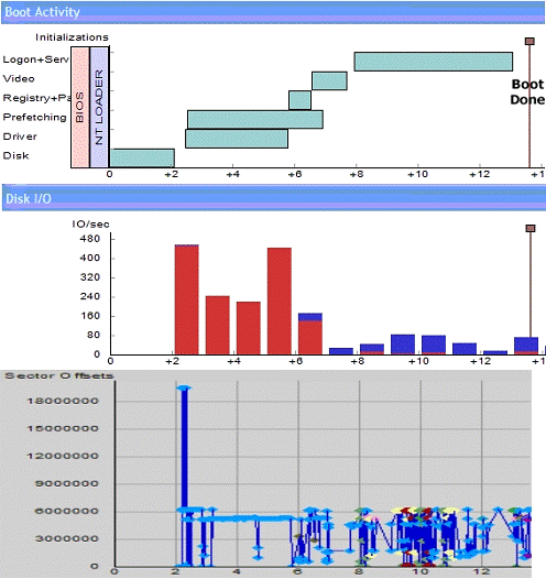 Note: Although the boot activity graph shows prefetching overlapped with the network card delay, it is misleading in the graph. All disk I/O is stalled. This could be seen by looking at the disk activity graph.