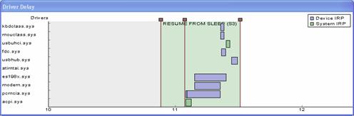 The Driver Delay window displays a graphical depiction of device drivers as they are sent system power IRPs (Sx and Dx) versus time. Refer to Figure 11.