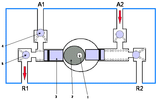 A1 Circuit primar al cilindrului principal. A2 Circuit secundar al cilindrului principal. R1 Circuit de refulare al circuitului primar. Dupa procesare, semnalele de iesire asigura comanda electrovanelor si a motorului de pompa. El calculeaza viteza de referinta a vehiculului raportata la deceleratia (sau acceleratia) rotilor (captori de viteza ai rotilor) si în consecinta deducând alunecarea. Purjarea circuitului hidraulic.Sunt posibile doua metode de purjare în functie de interventia pe sistem :