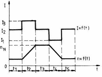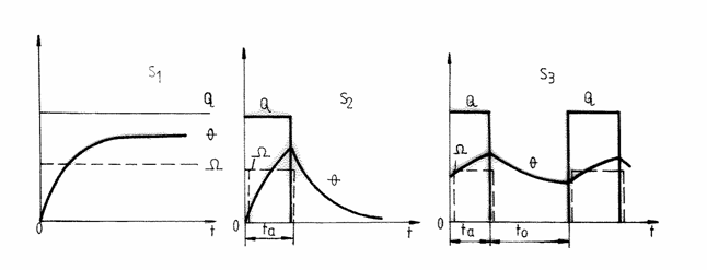 Serviciul intermitent se caracterizează prin aceea că motorul este conectat la retea si functionează un timp ta, după care este deconectat urmând o perioadă de pauză t0 când motorul este oprit. În figura 7.9. este prezentată o diagramă de sarcină din care se observă că intervalele de functionare alternează cu intervalele de pauză. De remarcat că în timpul functionării temperatura motorului nu atinge valoarea stationară, deci ta<(3 4)T, iar în timpul pauzelor motorul nu se poate răci până la temperatura mediului ambiant, adică t0<(3 4)T'. Durata unui ciclu, până la care functionarea se consideră intermitentă, este standardizată la valoarea tc=10 min.