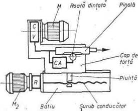 Prin lantul cinematic compus din cutia de viteze CV, cutia de avansuri CA, roata dintata si cremaliera montata rigid pe pinola se realizeaza miscarea de avans.