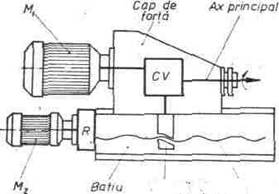 Pe batiul unitatii de lucru (fig.11) se afla montat motorul M2 care, prin intermediul reductorului R, a surubului conducator si a piulitei montate rigid pe capul de forta, realizeaza miscarile de avans rapid de apropiere si indepartare precum si miscarea de avans tehnologic. Miscarea principala de rotatie se realizeaza cu ajutorul motorului M1 si a cutiei de viteze CV.
