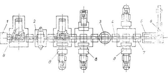 intoarcere, 5 – actionarea, 6 – impingator, 7 – piesa, 8 – masini-unelte