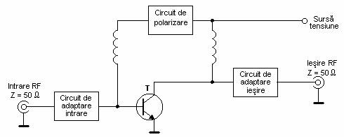 Circuitele de adaptare, realizeaza cu elemntele sale componente LC adaptarea impedantelor de intrare respectiv de iesire ale tranzistorului, la impedanta de 50 Ω dintre etaje sau cu sarcina, īn cazul ca amplificatorul īn cauza este cel final. Circuitul de polarizare are rolul de a mentine constant punctul de functionare al tranzistorului corespunzator clasei de functionare, īn conditiile variatiilor de curent prin tranzistor īn functie de semnalul aplicat.