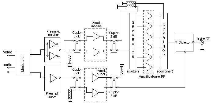 Fig. 84. Schema bloc a unui etaj de amplificare de RF care utilizeaza cuplori de 3 dB