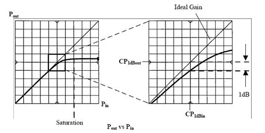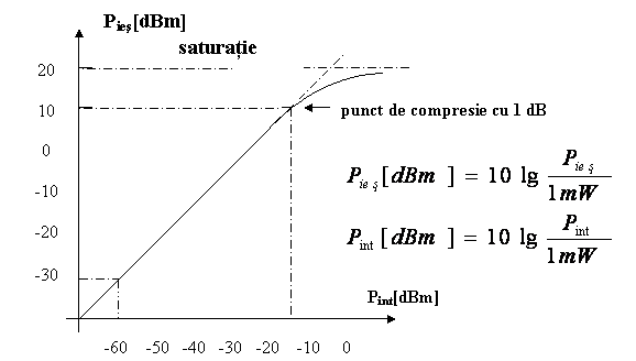 O alta modalitate de apreciere a liniaritatii unui ARFP este cu ajutorul punctului de compresie cu 1dB, care se determina grafic prelungind dreapta ce defineste zona liniara de functionare a ARFP si stabilind pe aceasta punctul fata de care caracteristica reala este la o distanta de 1dB (vezi figura 7). Cu cat acest nivelul semnalului de intrare corespunzator este mai mare, cu atat liniaritatea ARFP-ului este mai buna.