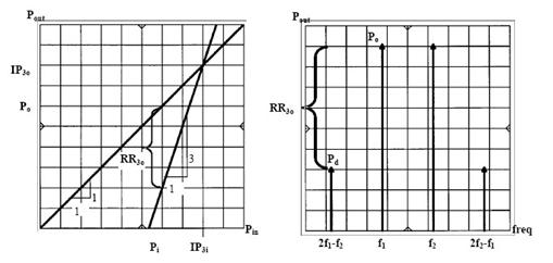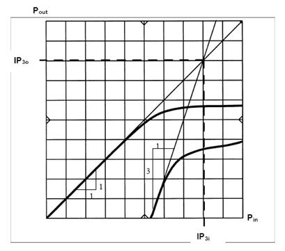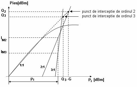 In fig. 10 este reprezentata dependenta puterii de iesire pentru o frecventa fundamentala a semnalului de intrare in functie de puterea de intrare, considerand o panta unitara a portiunii liniare, precum si modificarea puterii produselor de intermodulatie de ordinul trei odata cu fundamentala. Panta acestei din urma caracteristici va fi trei. Punctul de interceptie de ordinul trei se poate raporta la oricare din portile amplificatorului - la poarta de intrare - IP3i, respectiv de iesire - IP3ies. Intre cei doi parametri va exista relatia: