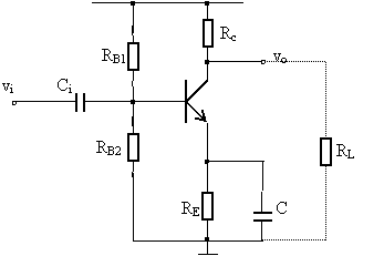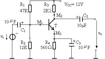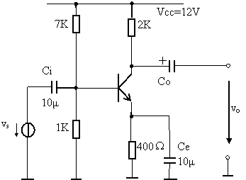 Tranzistorul BC107 din figura este folosit ca amplificator în conexiunea EC. La intrare se aplica o sursa sinusoidala vi.