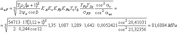 Distanta dintre axe a angrenajului echivalent awn