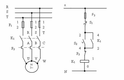 F1,F3- sigurante ; K1-contactor(contactoare principale) ; F2- relee termice(contacte de relee termice) ; S1- buton de oprire ; S-buton de pornire.