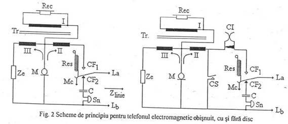 Aparatul telefonic, electromagnetic, cu disc a fost conceput ca o extensie a celui fara disc, pentru a exista o conceptie unitara de proiectare si pentru a se putea mai usor adapta fabricatia la cerintele impuse de beneficiari. Astfel, schema de principiu a telefonuIui electromagnetic fara disc este reprezentata in fig. 2.a. Aparatul utiIizeaza un receptor electromagnetic si un microfon cu carbune.