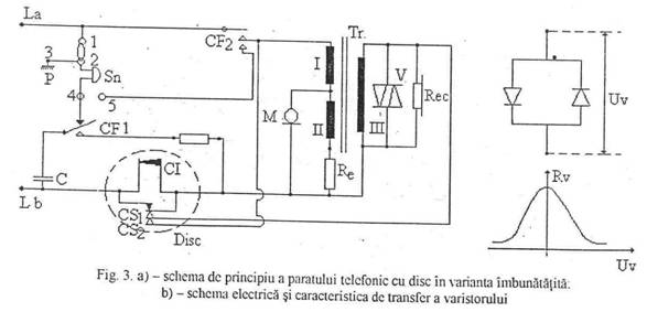 Carcasa telefonului are prevazut locul pentru disc, care la aparatele fara disc este închis cu un disc faIs, realizat din acelasi material cu carcasa. Telefoanele actuale cu disc respecta schema de principiu indicata în fig. 2.b, la care s-au mai introdus câteva îmbunatatiri. În fig. 3.a este indicata schema de principiu a aparatului electromagnetic cu disc: