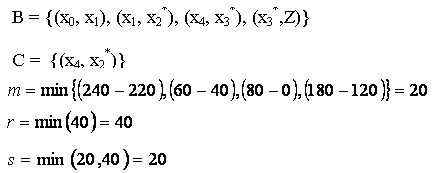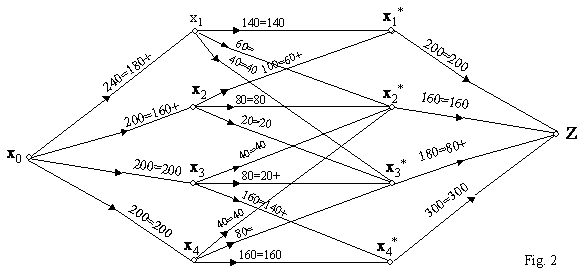 Pe arcele care leaga centrul fictiv x0 (intrarea în retea) de centrele de expediere au fost trecute cantitatile disponibile acestoe centre, iar pe arcele care leaga centrele de destinatie cu punctul Z (iesirea din retea) au fost trecute cantitatile cerute de centrele de destinatie. Pe arcele care reprezinta ruta de transport au fost trecute capacitatile mijloacelor de transport existente.