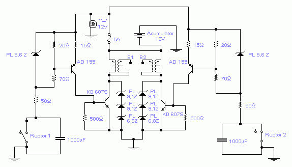 Diodele 1N4003 au rolul de a stabiliza tensiunea de comanda in baza tranzistoarelor AD 155.