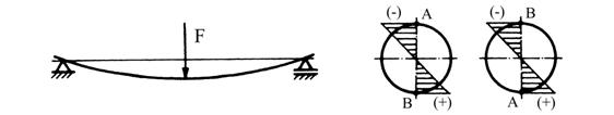 Cele mai uzuale situatii de functionare a arborilor sunt când directia sarcinii este constanta, caz în care, la o rotatie completa a arborelui, fiecare fibra a materialului trece odata prin dreptul directiei sarcinii. În acest mod functioneaza arborii reductoarelor de turatie, cutiilor de viteze, de distributie si transmisiile centrale ale autovehiculelor, transmisiilor masinilor unelte etc. Ca urmare a acestui mod de functionare, tensiunea de încovoiere variaza dupa un ciclu alternant simetric (fig. 5.15). Fibrele arborelui sunt supuse alternativ la compresiune (fibra A) sau la tractiune (fibra B), iar dupa o rotire a arborelui cu 180ș, la compresiune (fibra B) si la tractiune (fibra A).