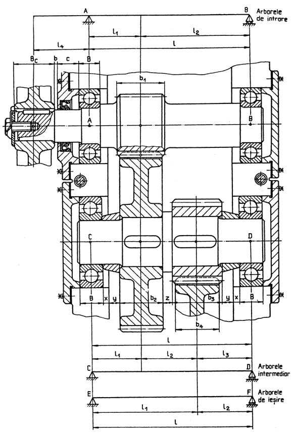 Pe baza schemei din fig. 5.16, rezulta distantele dintre punctele de aplicatie ale fortelor exterioare si dintre acestea si punctele de aplicatie ale reactiunilor din lagare, pentru arborele intermediar: