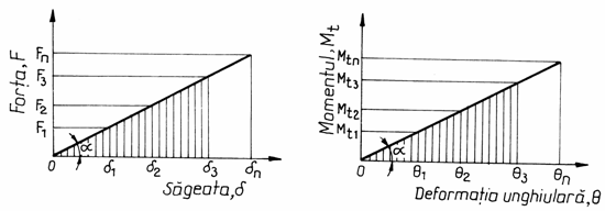 Caracteristicile cu rigiditate progresiva au panta crescatoare, iar caracteristicile cu rigiditate regresiva au panta descrescatoare. Lucrul mecanic de deformatie al arcurilor cu caracteristica elastica neliniara se exprima sub una din formele (v. fig. 5.2):