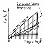 Daca arcurile sunt realizate din mai multe elemente suprapuse (arcuri în foi, arcuri inelare, arcuri disc) sau daca arcul este realizat dintr-un material cu frecari interne considerabile (arcuri din cauciuc), caracteristica elastica (fig. 5.3) prezinta o diferenta între încarcare si descarcare (asa-numitul "histerezis"). Lucrul mecanic absorbit de arc în timpul încarcarii (suprafata de sub caracteristica de încarcare) este diferit de lucrul mecanic cedat de arc în timpul descarcarii (suprafata de sub caracteristica de descarcare).