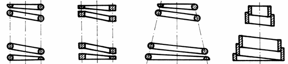 În fig. 5.4 sunt prezentate câteva solutii de arcuri elicoidale de compresiune, iar în fig. 5.5 sunt prezentate elementele geometrice ale arcurilor cilindrice elicoidale de compresiune cu sectiunea spirei rotunda (fig. 5.5, a) si dreptunghiulara (fig. 5.5, b).