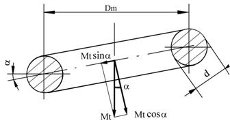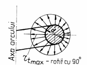 În fig. 5.11 este prezentata o schema a arcului elicoidal cilindric de torsiune, din care se observa încarcarea realizata prin aplicarea unei forte F la bratul R. În urma încarcarii cu momentul de torsiune Mt = FR, capatul activ al arcului se roteste cu unghiul q Calculul de rezistenta Asupra spirei arcului actioneaza momentul de torsiune Mt, care se descompune în doua componente (v. fig. 5.12): Mtcosa - perpendiculara pe planul spirei - determina solicitarea de încovoiere a spirei; Mtsina - aflata în planul spirei determina solicitarea de torsiune.