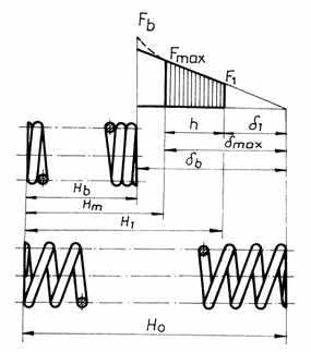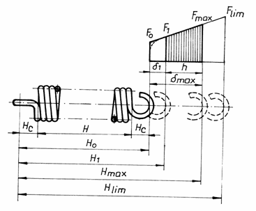 Teoretic, arcurile elicoidale cilindrice de tractiune au caracteristica elastica liniara, identica cu a arcurilor elicoidale cilindrice de compresiune (v. fig. 5.8). Practic, arcurile elicoidale de tractiune se realizeaza, de regula, cu spirele înfasurate strâns. Prin aceasta, spirele nu numai ca sunt în contact în stare libera, dar sunt si apasate reciproc, datorita unei forte initiale de pretensionare. Caracteristica elastica a acestor arcuri si parametrii care o definesc sunt prezentate în fig. 5.10. Notatiile utilizate sunt: HC - înaltimile ochiurilor de prindere; H - lungimea activa a arcului în stare libera; H - lungimea arcului în stare libera; F - forta de montaj; d , H1 - sageata, respectiv lungimea arcului montat, încarcat cu forta F1; Fmax - sarcina maxima de functionare;