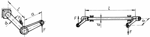 Sectiunea arcului poate fi rotunda (fig. 5.15, a), inelara, patrata, dreptunghiulara (fig. 5.15, b), hexagonala, compusa din mai multe bare rotunde (fig. 5.15, c) sau dintr-un pachet de lamele (fig. 5.15, d). Cel mai frecvent se întâlnesc barele cu sectiune rotunda, care asigura uniformitatea distributiei tensiunii tangentiale si simplitate tehnologica. Avantajele arcurilor bara de torsiune sunt: dimensiuni de gabarit reduse; constructie simpla; montaj si întretinere usoara; lipsa frecarilor interioare; tehnologie de executie relativ simpla; Arcurile bara de torsiune se utilizeaza la suspensia autovehiculelor, cuplaje elastice, chei dinamometrice, aparate de masura, instalatii de încarcare a standurilor de încercare etc. Calculul de rezistenta al arcurilor bara de torsiune de sectiune circulara se efectueaza la solicitarea de torsiune, conform schemei de calcul prezentate în fig. 5.16. Relatia de verificare la torsiune este în care momentul de torsiune se determina în functie de forta F si bratul a la care este aplicata pe levier Mt = Fa. Din relatia tensiunii de torsiune se obtine relatia de dimensionare a arcului bara de torsiune Rezistenta admisibila la torsiune se alege în functie de materialul arcului, caracterul solicitarii (statica sau variabila), diametrul barei si starea suprafetei acesteia, luând valori în intervalul tat = 500.800 MPa. Calculul la deformatii (v. fig. 5.16) se efectueaza pe baza relatiei