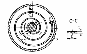 Arcurile spirale plane preiau momente de torsiune, numele lor venind de la faptul ca banda din otel de arc, din care sunt confectionate, este înfasurata dupa o spirala arhimedica (fig. 5.18). Asemanator cu constructia arcului elicoidal de torsiune, un capat este fixat, iar la capatul opus se aplica momentul de torsiune. În fig. 5.18 s-a notat cu: 1 - arcul spiral plan, 2 - arborele de încarcare prin intermediul caruia se aplica momentul de torsiune Mt, 3 - carcasa în care se încastreaza capatul exterior al arcului. Arcul spiral plan se utilizeaza, în principal, ca element motor, având capacitate mare de deformatie si de înmagazinare de energie - la armare - energie pe care o poate ceda ulterior, în timp. Este întâlnit, cu precadere, la mecanisme de ceas si aparate de masura. Calculul de rezistenta se efectueaza la solicitarea de încovoiere, momentul de încovoiere care solicita spira arcului fiind egal cu momentul de torsiune preluat de catre arc Mi = Mt. Relatia de verificare la încovoiere este