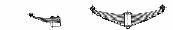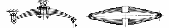 unde E reprezinta modulul de elasticitate longitudinal al materialului arcului. Conform acestei relatii, caracteristica elastica a arcului monolamelar este liniara. Arcuri în foi Arcurile în foi sunt compuse din mai multe arcuri lamelare suprapuse, de lungimi diferite, asamblate astfel încât toate sa participe la deformatie. Arcurile în foi sunt frecvent folosite la suspensia vehiculelor (rutiere si feroviare), în constructia amortizoarelor, instalatiilor de forjare, la tampoanele ascensoarelor etc. În fig. 5.20 sunt prezentate câteva variante constructive uzuale: a - cu un singur brat (sfertul de arc); b - cu doua brate, cu preluarea sarcinii la mijlocul arcului (arc semieliptic); c - cu doua brate, cu preluarea sarcinii la un capat al arcului (arc cantilever); d - format din doua brate suprapuse (arc dublu sau eliptic). O varianta mai noua este cea prezentata în fig. 5.20, e, cu lamele cu grosime variabila, aceasta constructie reducând greutatea arcului cu cel putin 30% . Prin separarea lamelelor cu garnituri din material plastic (v. fig. 5.20, e), frecarea dintre lamele se poate reduce cu 80% .