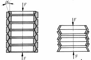 Arcurile inelare se obtin prin înserierea unor inele tronconice interioare sau exterioare, asamblate alternant, cu contact pe suprafretele conice (fig. 5.21). Arcurile inelare preiau o sarcina exterioara de compresiune, sub actiunea careia inelele interioare tind sa îsi micsoreze diametrul, comprimându-se, iar inelele exterioare tind sa îsi mareasca diametrul, întinzându-se. Între inele apar forte de frecare mari, lucrul mecanic de frecare ajungând la 60.70% din lucrul mecanic al fortei exterioare, ceea ce conduce la capacitate mare de amortizare. Datorita acestei caracteristici, arcurile inelare se utilizeaza ca arcuri tampon, la preluarea unor sarcini foarte mari (la arcurile tampon de la materialul rulant). Unghiul a (v. fig. 5.21) al suprafetelor conice (a ) se alege astfel încât sa se evite întepenirea arcurilor si sa permita revenirea acestora la forma initiala, dupa încetarea actiunii sarcinii exterioare.