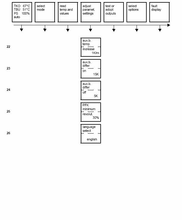 Dupa ce s-a ales meniul dorit, se poate naviga prin submeniuricu ajutorul butonului de selectare pentru a vizualiza sau modifica setarile. Vezi cap. 4.1. Dispozitiv de reglare pentru utilizatorul final (fara parola), pag. 15 |