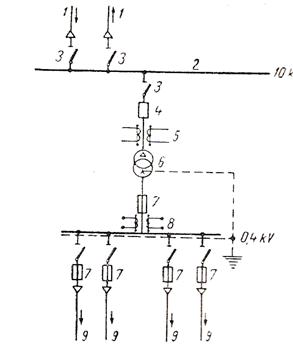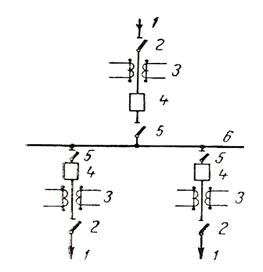 separatoare pentru instalații interioare. III. Transformatorul 1 este conectat la rețea prin siguranțele cu mare putere de rupere 2 și un separator de linie 3. partea de joasă tensiune este realizată dintr-o cutie metalică de distribuție 4, prinsă pe suporturi. În cutie se află tabloul electric cu siguranțe fuzibile.