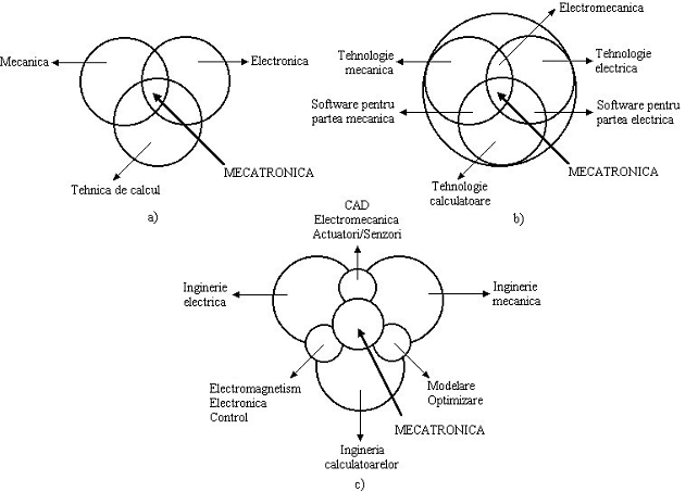 Fig. 1.1 Diagrame pentru ilustrarea notiunii de mecatronica: a) Conceptul Universitatii Stanford; b) Conceptul Universitatii Missouri-Rolla; c) Conceptul Universitatii Purdue