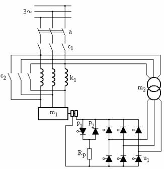 Curentul alternativ din înfasurarea de excitatie se închide prin ansamblul p1-p2; o alternanta prin p1 si alta prin p2. Dupa atingerea vitezei maxime la functionarea în asincron se blocheaza tiristorul p1 si se comanda intrarea în functie a redresorului comandat u1, alimentat de la retea prin transformatorul m2. Puntea u1 permite si fortarea excitatiei prin marirea sarcinii aplicate.