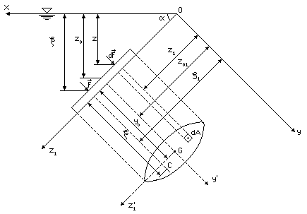 afata de suprafata libera a lichidului. Se alege sistemul de axe yOz în planul suprafetei A cu axa Oy în planul suprafetei libere iar axa Oz, în lungul liniei de cea mai mare panta a peretelui înclinat.