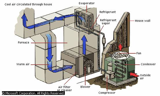 Sistemele de aer conditionat cu apa calda, ca cel de mai sus, sunt folosite pentru ca aerul dintr-o casa sa nu devina insuportabil de cald, umed sau uscat. Aceste sisteme sunt destul de complexe. Aceste sisteme au trei cicluri separate. Aerul care trece prin conductele din casa, fluxul de aer care trece prin afara casei ,si tranferul ditre ele. Aerul trece printr-un filtru pentru a se curata de particule de praf, apoi trecand printr-un suflator care trimite aerul in evaporator. Aerul cald vaporizeaza refrigerantul, care raceste aerul si transporta caldura in afara casei. Aer curat si rece trece prin conducte si apoi in casa, ciclul repetandu-se dupa aceea.