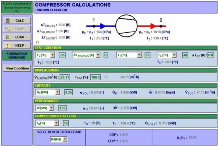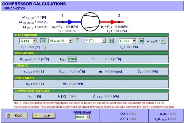 In afara ferestrei principale, a modulului pentru alegerea compresorului, cu conditii de lucru cunoscute, prin apasarea butonului "New Condition" se va deschide o noua fereastra care permite evaluarea comportarii compresorului in alte conditii decat cele definite anterior. Cele doua ferestre pot fi utilizate pentru a descrie intr-una conditiile reale de lucru ale compresorului, din instalatie, iar in cealalta conditiile de lucru descrise in catalog. In acest mod se poate testa in ce masura un compresor ales din catalog va face fata in conditiile de lucru din instalatie, sau cunoscand conditiile de lucru din instalatie, se pot alege diferite compresoare din catalog, pentru a vedea care dintre acestea este cel mai potrivit pentru a fi ales.