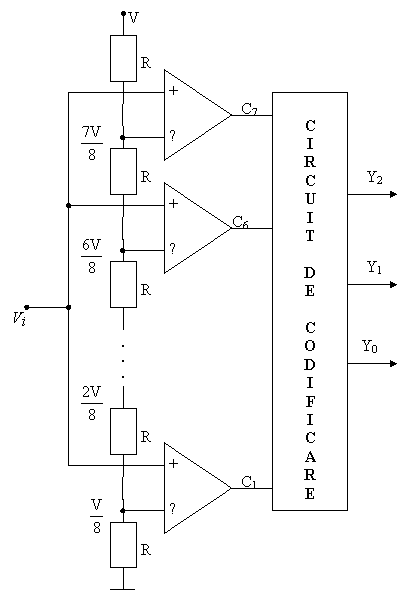 Tensiunea constanta V si cele 8 rezistente inseriate (R) creaza potentialele echidistante ce se aplica la intrarile (-) ale comparatoarelor V/8; 2V/8 . 7V/8. Aceste potentiale reprezinta pragurile de basculare ale comparatoarelor. La intrarile reinversoare ale comparatoarelor se aplica simultan semnalul analogic Vi. La un moment dat acele comparatoare al caror prag este < Vi vor avea la iesire nivelul ridicat 1, iar cele ce au pragul peste Vi vor avea la iesire 0. Circuitul de codificare ne da codul binar corespunzator.
